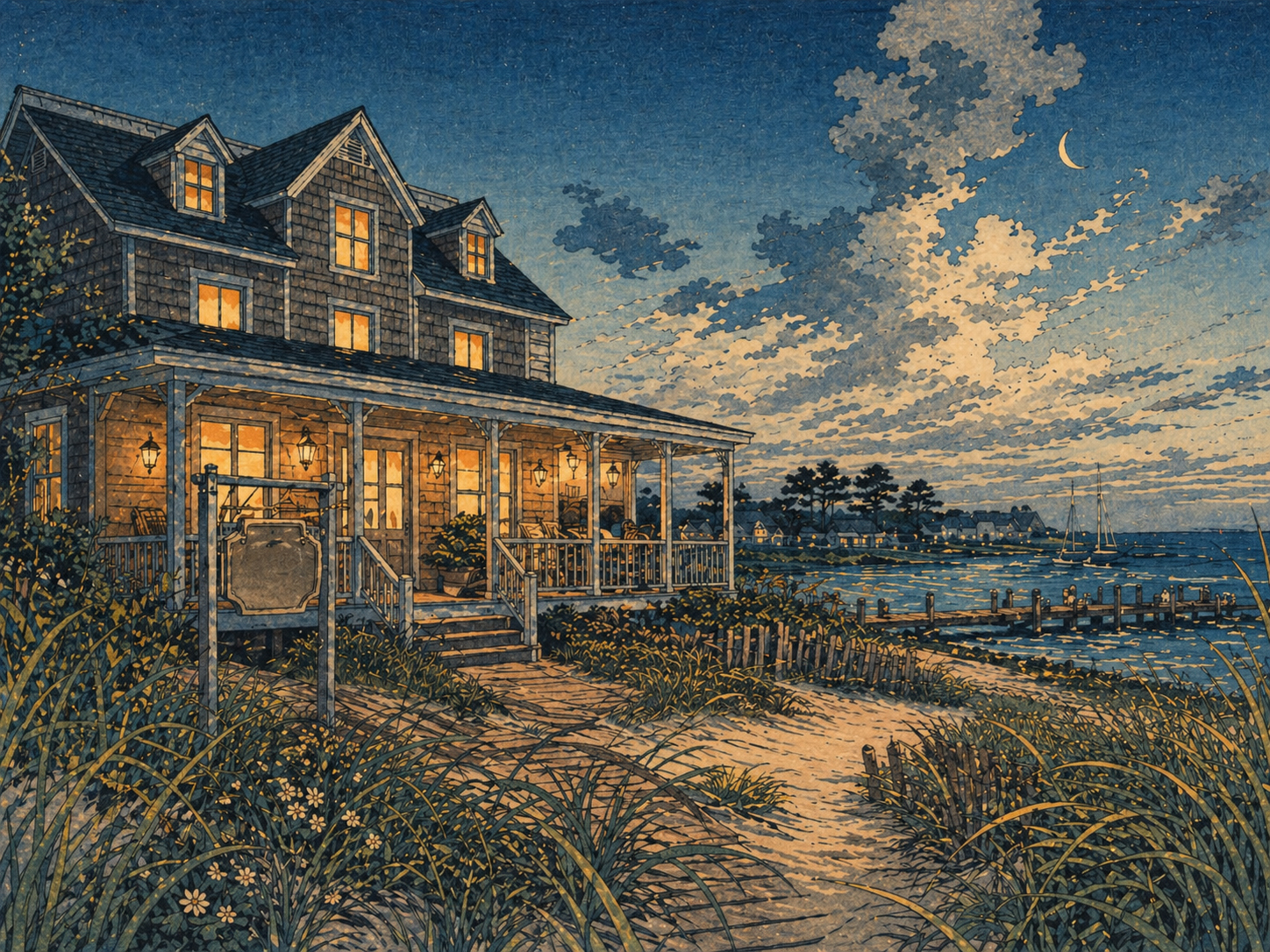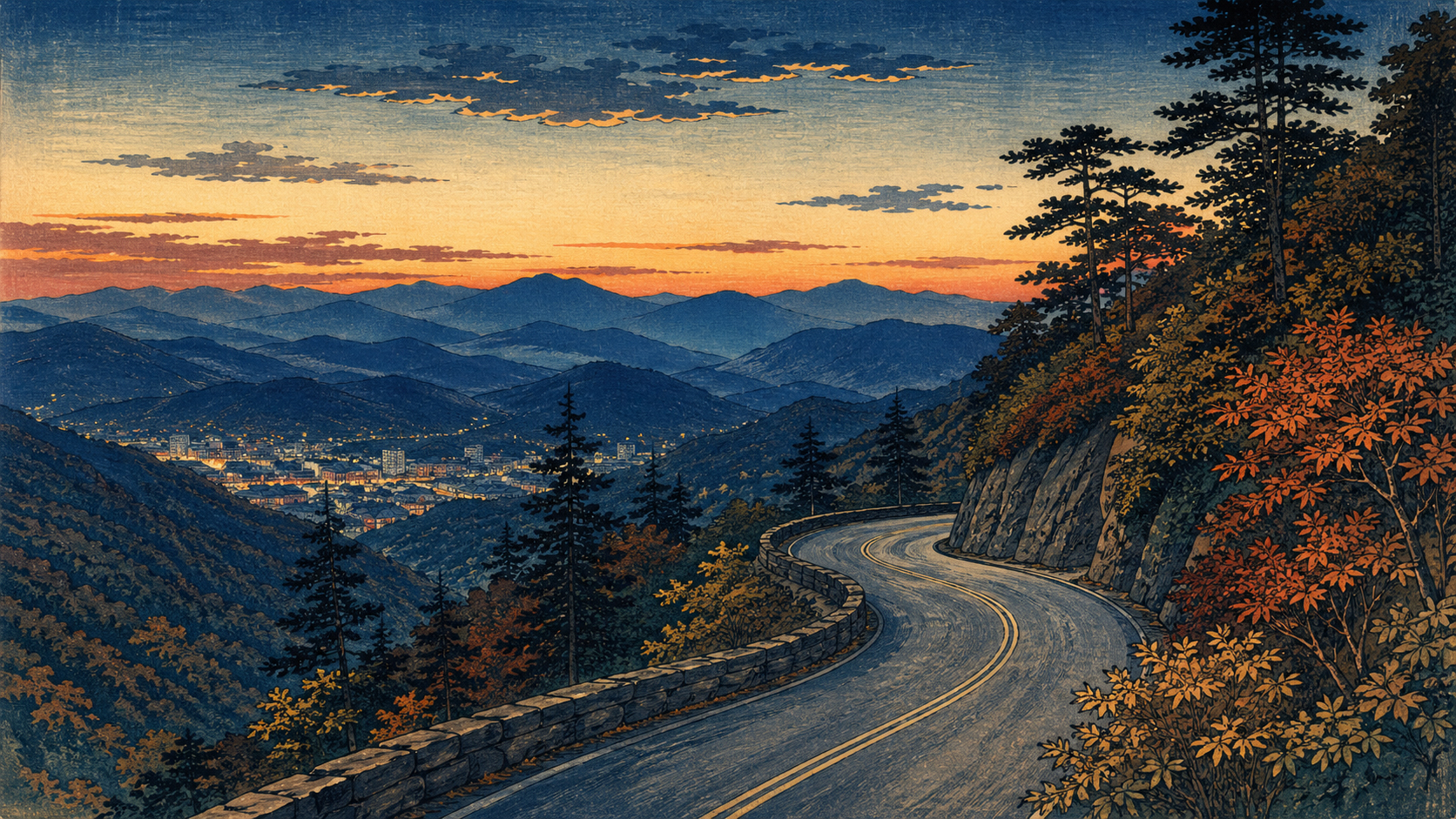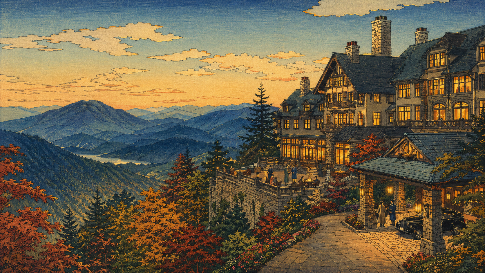 霧、山道、アシュビル、工房、庭園、山の宿。